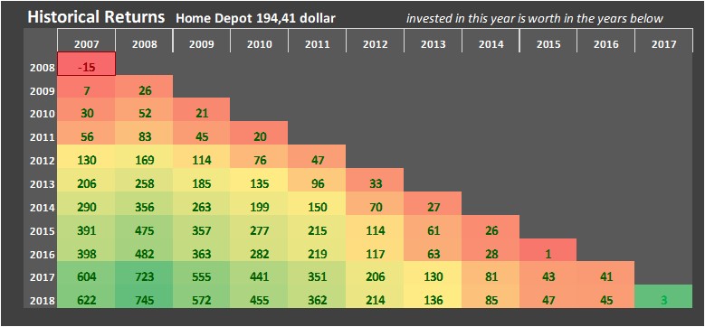 Die Matrix oberhalb zeigt die historischen Gewinne von Home Depot , je nach Einstiegsjahr das in der linken ersichtlich ist.